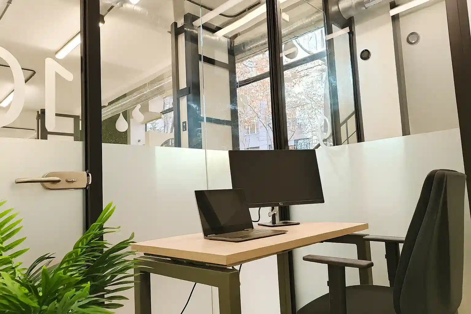 Nuestros espacios están en Chamartín, junto al Bernabéu. No somos una oficina fría ni hay solo escritorios compartidos. Aquí alquilas tu despacho privado, por meses, y con todo incluido.